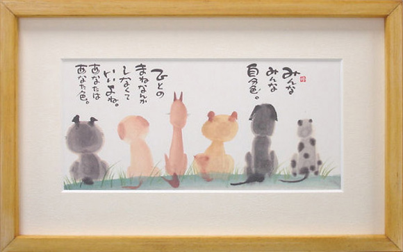 やさしく語りかける言葉と、どこかほっとする絵。一度焼いて色付けをした額に入れております。一点一点違った風合いをお楽しみください。