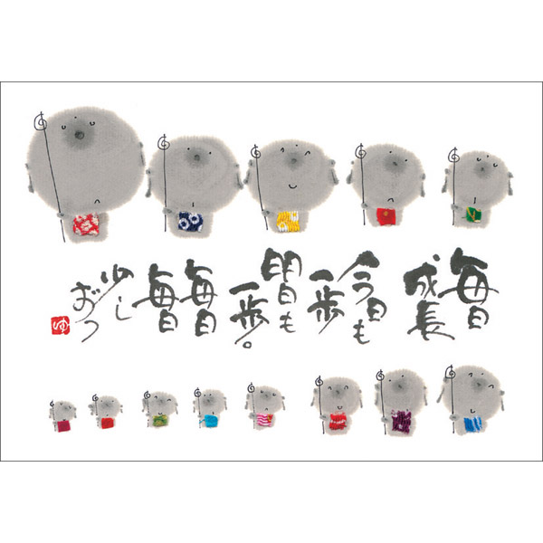愛らしいお地蔵さんをはじめ、猫・天使・ふくろう・お花などのモチーフと、温かい書のメッセージ。